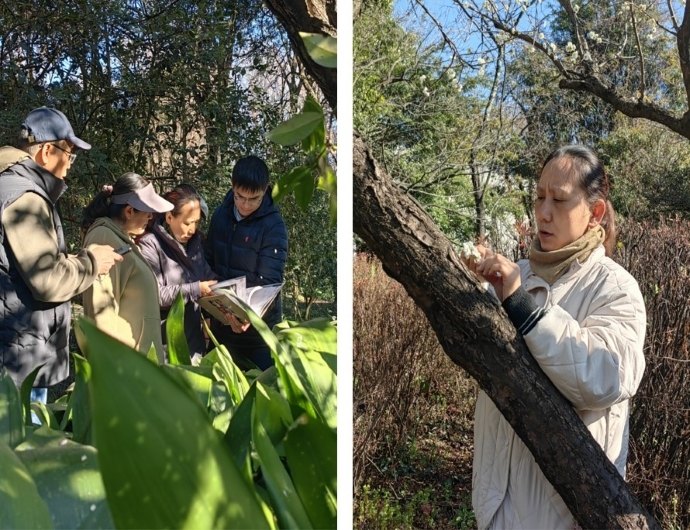 华珊在昆明植物园现场指导梅花品种鉴定 经鉴定,园区内分布有48株梅花植株。其中,41株梅花已确定分属17个品种,梅花原生种1株,树龄超过30年,待鉴定植株6株。它们被分散定植于东园、所园区、蔷薇园、百草园和扶荔宫等多个专类园区。工作人员依据鉴定结果,更新和完善了昆明植物园活植物信息系统(PIMS)的梅属植物物种信息,上传了植株特写照片,提升了数据档案质量。此外,本次邀请特定植物类群专家现场鉴定的工作模式,对园区内其他植物类群的鉴定工作具有借鉴意义。