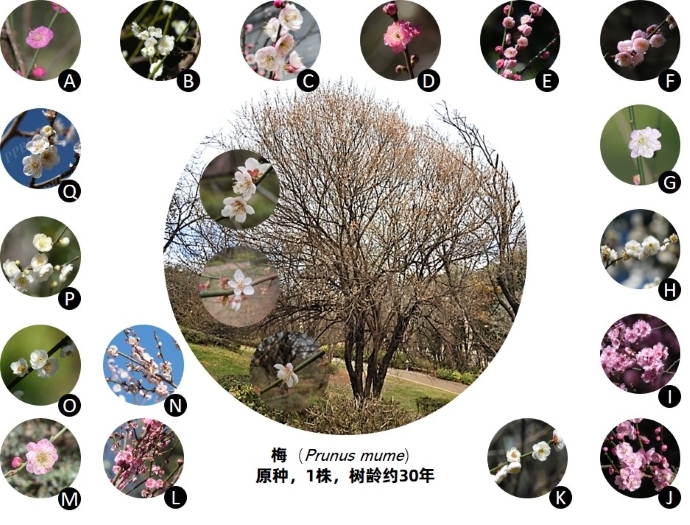 昆明植物园已鉴定梅花品种(制图:高富) (A:白须朱砂 (Prunus mume ‘Baixu Zhusha’);B:变绿萼 (Prunus mume ‘Bian Lü-e’);C:飞蝶 (Prunus mume ‘Feidie’);D:丰后 (Prunus mume ‘Fenghou’);E:红怀抱子 (Prunus mume ‘Honghuai Baozi’);F:昆明宫粉 (Prunus mume ‘Kunming Gongfen’);G:六瓣淡粉 (Prunus mume ‘Liuban Danfen’);H:龙潭玉蝶 (Prunus mume ‘Longtan Yudie’);I:美人梅 (Prunus mume ‘Meiren Mei’);J:水朱砂 (Prunus mume ‘Shui Zhusha’);K:素白台阁 (Prunus mume ‘Subai Taige’);L:桃红朱砂 (Prunus mume ‘Taohong Zhusha’);M:晚粉抱子 (Prunus mume ‘Wan Yun’);N:小宫粉 (Prunus mume ‘Xiao Gongfen’);O:小绿萼 (Prunus mume ‘Xiao Lü-e’);P:复瓣绿萼 (Prunus mume ‘Fuban Lü-e’);Q:江梅 (Prunus mume ‘Jiang Mei’);其中,梅,原种植株照片作者为高富;C照片作者为华珊;Q照片作者为黄汉文;其他照片作者均为文妍莉。)